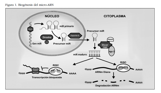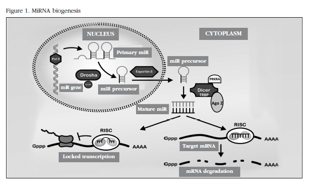 Los miRs fueron descubiertos en 1993 al estudiar la regulación del desarrollo del nemátodo Caenorhabditis elegans [ 1 ]. Son pequeñas moléculas de ARN (21-23 nucleótidos), no codificantes para proteínas que constituyen una extensa familia de genes reguladores postranscripcionales. Están implicados en la regulación de varios procesos biológicos, como la diferenciación celular, la proliferación, la apoptosis y en el desarrollo embrionario y tisular [ 2 ]. Funcionan como un gen epigenético endógeno y, aunque generalmente silencian genes diferentes de aquellos de los cuales se han transcrito, existen también miRs con función promotora y/o coactivadora para otros genes [ 3 ].
