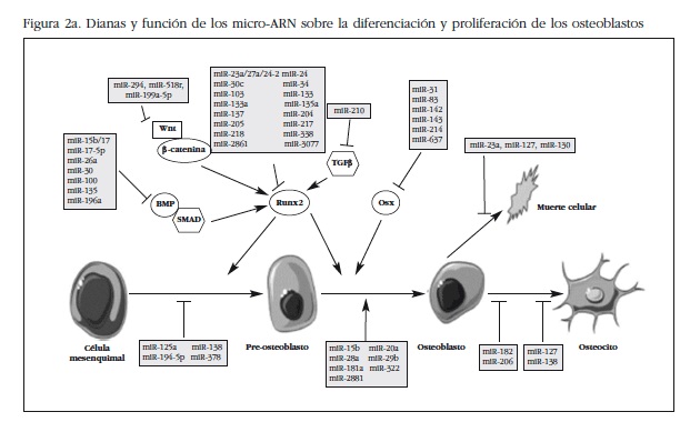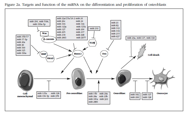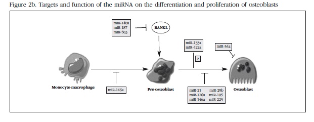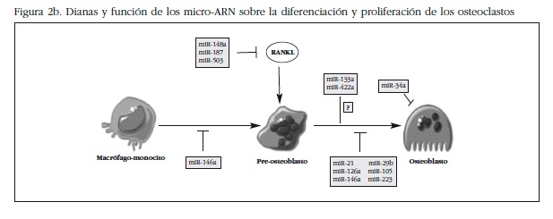 El miR-2861 ha sido el primer miR al que se le ha atribuido una implicación clínica en la osteoporosis humana [ 21 ]. El miR-2861 tiene como molécula diana una histona deacetilasa (HDAC5) la cual regula de manera negativa RunX2. Mutaciones en el locus que lo codifica inducen osteoporosis, y animales tratados con inhibidores de miR-286 presentan un fenotipo de baja masa ósea. Posteriormente se han descrito otros miRs que pueden desempeñar un papel importante en la regulación del metabolismo óseo teniendo como diana a varios genes que codifican factores de transcripción cruciales en el remodelado óseo; sin embargo, aún se desconoce cuáles de ellos están relacionados con una mayor o menor tasa de recambio óseo y baja masa ósea. En las figuras 2a y 2b podemos observar los distintos miRs que actúan tanto a nivel de células de estirpe osteoblástica como osteoclástica [ 22 , 23 , 24 , 25 , 26 , 27 , 28 ].