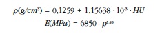 La geometría del fémur fue generada mediante el programa informático de tratamiento de imágenes y modelado mediante elementos finitos ScanIP (Simpleware, Exeter, Reino Unido). Este programa permite seleccionar el rango de Unidades Hounsfield (UH) necesario para una correcta visualización de la imágenes de TC, la aplicación de filtros de volumen/superficie y la generación de una geometría idéntica al espécimen que resulta en un modelo numérico con propiedades mecánicas dependientes de la densidad mineral ósea (DMO) apoyadas en las siguientes ecuaciones [8,9,10,11]: