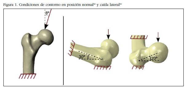 Disponer de un modelo geométrico numérico permite modificar las condiciones de carga, intensidad y vector, condiciones de contorno y propiedades mecánicas de resistencia. Consideramos que la carga elegida de 470 Newton para el análisis de las distintas configuraciones es el adecuado pues se corresponde al valor estimado de un adulto joven que es el punto de partida del modelo descrito. El vector de aplicación de la carga en bipedestación es el admitido en los distintos trabajos experimentales, lo mismo ocurre con el vector de aplicación en caída lateral.