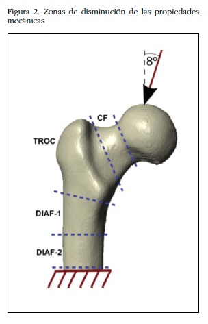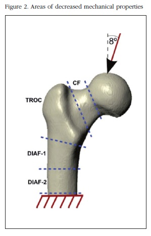 Casi la mayoría de las fracturas de cadera clínicas se dan en la zona de trocánter o en el cuello. Resulta muy interesante que estas dos zonas sean las más sensibles a la disminución simulada de los valores de DMO zonales. Esto conlleva que las cargas de rotura sean sensiblemente menores y por ello exista esta alta prevalencia clínica. Estos hallazgos refuerzan la validez del modelo desarrollado en la predicción de fractura.