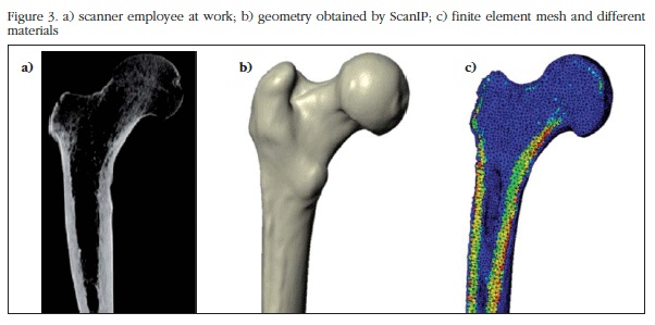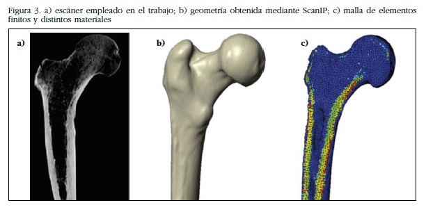 El modelo de elementos finitos de la EPF obtenido a partir de las imágenes médicas DICOM se muestra en la figura 3. El modelo ha sido generado mediante el programa informático ScanIP; en la figura 3b se observa la superficie del fémur, y en la figura 3c se muestra la heterogeneidad del modelo.