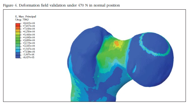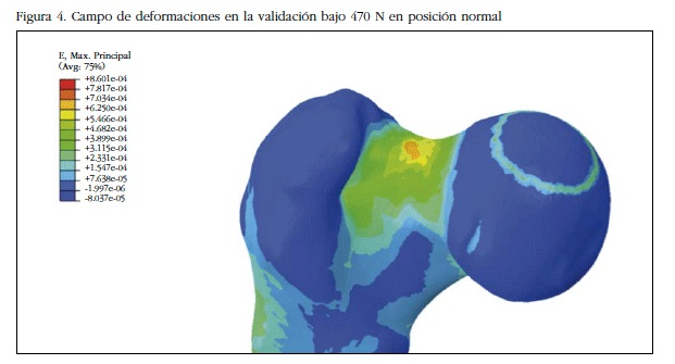 La validación de los resultados se realizó mediante comparación de nuestros valores obtenidos en dos configuraciones distintas: posición normal y caída lateral con los obtenidos en condiciones similares en trabajos de experimentación en cadáver humano [8]. A tal efecto asumimos que el inicio la rotura del hueso ocurre cuando se alcanza una deformación crítica de 0,0061 [14]. La magnitud de la carga de validación es de 470 N (75% del peso del sujeto).