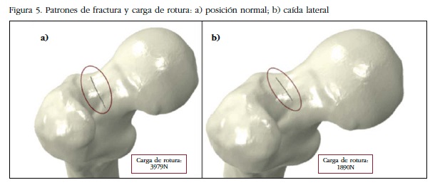 La figura 5 muestra el patrón de inicio de fractura en las condiciones descritas. Se puede observar cómo la carga de rotura en la configuración de caída lateral es menor que en la posición normal (en torno a un 50% menor, de 3.979 N a 1.890 N). En ambos casos la fisura se inicia en la zona superior del cuello femoral, aunque en el caso de caída lateral el inicio se produce más posterolateral en el cuello.