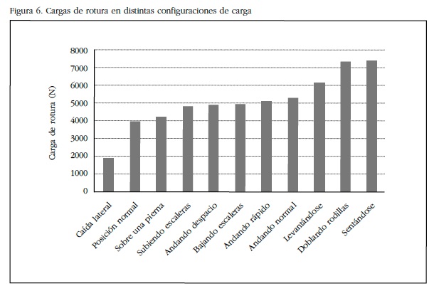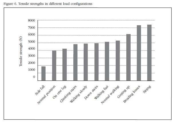 Al estudiar distintas configuraciones de carga se ha observado cómo la carga más crítica es la correspondiente a la caída lateral (un 50% menor que en la posición normal). El resto de posiciones de la vida diaria presentan una carga de rotura mayor que las anteriores. Esto se debe a que la geometría del fémur ha evolucionado para soportar cargas habituales (posición normal y el resto de posiciones de la vida diaria) en lugar de caídas laterales.
