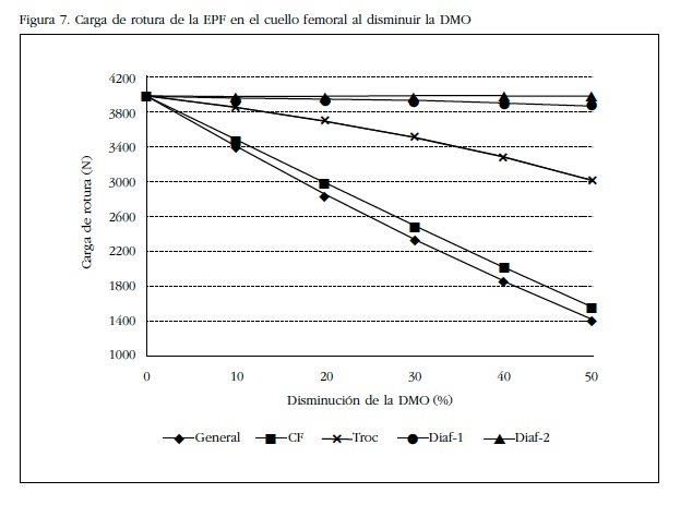 En las condiciones descritas de osteoporosis simulada mediante una disminución percentil de las propiedades mecánicas en distintas zonas de la EPF se objetiva el debilitamiento que se produce en la estructura ósea al disminuir la rigidez de ésta a causa de la osteoporosis. La figura 7 muestra la carga de rotura en función de la disminución de la DMO (se ha disminuido hasta en un 50% la densidad inicial).