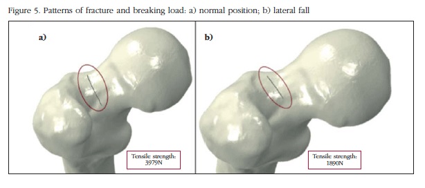 Los resultados obtenidos demuestran cómo el fémur está optimizado para cargas en condiciones fisiológicas; su morfología y su anisotropía hacen que las principales tensiones y deformaciones converjan hacia un alineamiento, permitiendo así que éste soporte mayor carga. En cambio, bajo una carga anormal, como es una caída lateral, las cargas no se encuentran alineadas con la dirección de soporte del fémur [21]. Así se observa cómo la carga de fractura para acciones de la vida cotidiana es mucho mayor que para condiciones no fisiológicas, como puede ser una caída lateral, ya que es lógico pensar que el fémur está adaptado a las cargas cotidianas de la vida diaria.