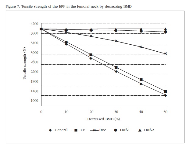 Desde el punto de vista macroscópico, los 3 factores que más afectan a la resistencia de la EPF son su geometría, la densidad mineral ósea y la carga traumática de la caída. Es obvio que disminuir la densidad mineral ósea del modelo conlleve una menor carga de rotura para producir fractura, como de hecho ocurre en la realidad. La posibilidad de poder disminuir esta densidad de un modo global o en zonas concretas abre una nueva línea de investigación que puede correlacionar los trabajos experimentales en los que es conocido que el hueso trabecular proporciona mucha menor resistencia ósea en la EPF que el hueso cortical.
