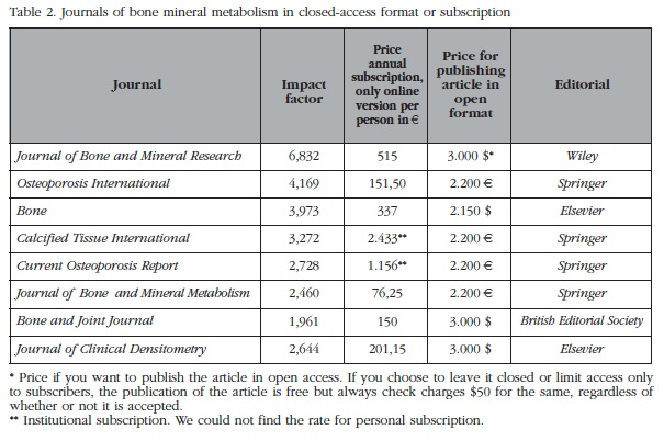 En las revistas clásicas, que existen en formato de papel y que posteriormente se han adaptado y se presentan también en formato digital, la publicación de artículos suele ser gratuita. La excepción la constituye Journal of Bone and Mineral Research, que cobra la cantidad de 50 dólares americanos en concepto de gastos de revisión, no retornables si el artículo es rechazado. Las demás revistas tradicionales no nos cobran por publicar nuestros artículos, si bien es cierto que suelen ofrecer la posibilidad de que paguemos para que sea publicado en formato de acceso abierto. La forma que tienen de cubrir sus gastos suele ser por una combinación de la suscripción de sus lectores con el apoyo de la sociedad científica de la cual la revista es su publicación oficial. No es raro que uno de los incentivos que ofrecen algunas sociedades científicas para captar asociados sea la suscripción a la revista, lo cual conlleva a que en ocasiones el costo de sólo la suscripción a la revista sea más elevado que la inscripción como asociado en la sociedad. Una relación de estas revistas se muestra en la tabla 2, ordenadas de forma decreciente según su factor de impacto, y en la que mostramos el precio de la suscripción sólo en su versión online.