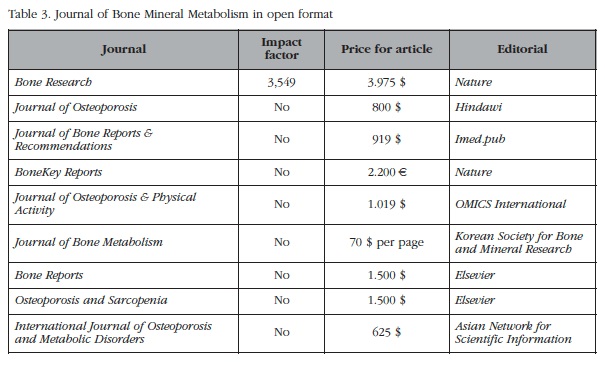Solo hemos encontrado una revista específica sobre metabolismo mineral óseo que sea de acceso abierto y tenga factor de impacto, y es Bone Research. Sus características se muestran en la tabla 3.
