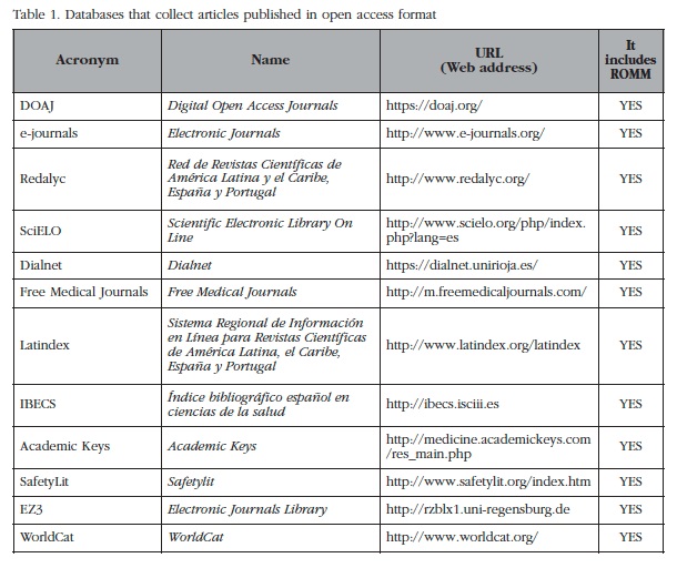 El número de estas revistas ha crecido de forma exponencial en los últimos años, de manera que en la actualidad sólo en el campo de la Medicina el número de esta revistas es de varios centenares. Como indicábamos anteriormente, la mayor parte de ellas no están incluidas en Journal of Citation Reports y por lo tanto no tienen factor de impacto, y tampoco lo están en PubMed. Suelen obtenerse de bases de datos de revistas que comparten el denominado formato acceso abierto. Una relación no exhaustiva de estas bases de datos se muestra en la tabla 1.