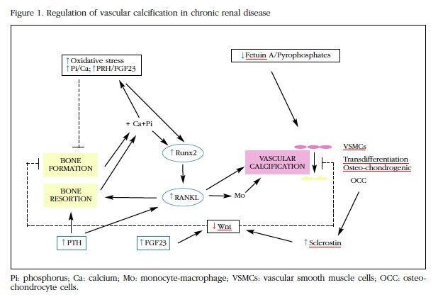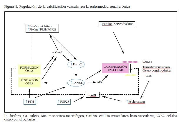 Inicialmente se consideró como un trastorno secundario al depósito pasivo de calcio y fósforo en la pared vascular. Sin embargo, más recientemente se ha señalado que la calcificación vascular sería un proceso perfectamente regulado mediante el cual las células del músculo liso vascular (CMLV) experimentan cambios moleculares y fenotípicos por los que adquieren algunas de las funciones que caracterizan a las células de estirpe osteo-condrocitaria [1,2], y que conducen a la liberación por las CMLV de estructuras vesiculares que contienen hidroxiapatita [5]. En este proceso de “transdiferenciación osteo-condrocitaria” intervendrían distintos factores implicados en la diferenciación de las células óseas, como el Runx2, las proteínas morfogénicas óseas (BMPs), el sistema RANK/RANKL/OPG o la vía Wnt. Por otra parte, en pacientes con ERC y en modelos animales de esta enfermedad, el aumento de la calcificación vascular se acompaña de una reducción de la masa ósea, lo que sugiere que las señales que intervienen en la mineralización del hueso y de la pared vascular podrían comportarse de modo distinto en función del microambiente tisular en donde actúen [6,7].