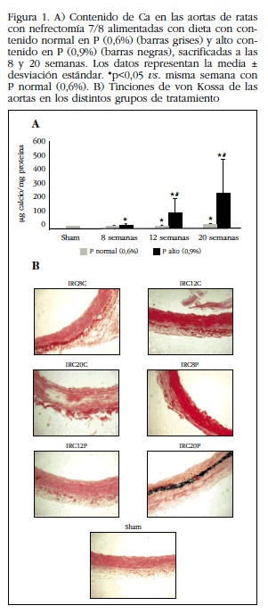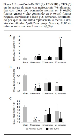 Resultados: A las 20 semanas, un 50% de los animales con dieta alta en fósforo presentó calcificaciones aórticas que se acompañó de aumento en la expresión aórtica de RANKL. Por el contrario, la OPG disminuyó como consecuencia probablemente del componente inflamatorio.