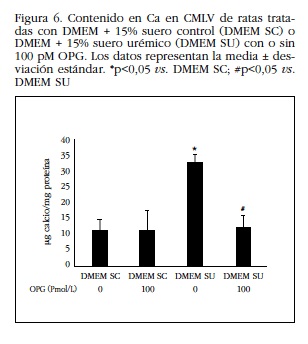 Para confirmar la idea de que el incremento de la expresión de RANKL es responsable del aumento contenido en Ca en CMLV tratadas con suero urémico, se adicionó al medio de cultivo 100 pM de OPG, lo que produjo un descenso significativo de la misma (Figura 6).