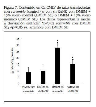 Del mismo modo, el silenciamiento del receptor RANK mediante la técnica de shRNA redujo de manera significativa el contenido de Ca de las CMLV tratadas con suero urémico (Figura 7).