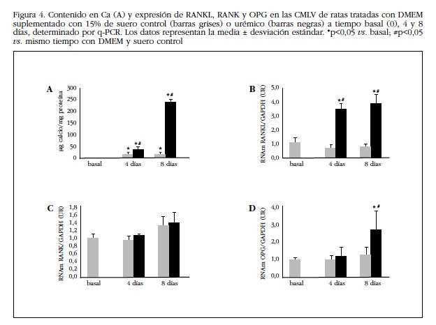 El suero urémico indujo un incremento significativo del contenido de Ca a los 4 y 8 días (Figura 4A). Se produjo un incremento significativo de la expresión de RANKL (a los 4 y 8 días) y OPG (a los 8 días de tratamiento) (Figuras 4B, 4C y 4D).