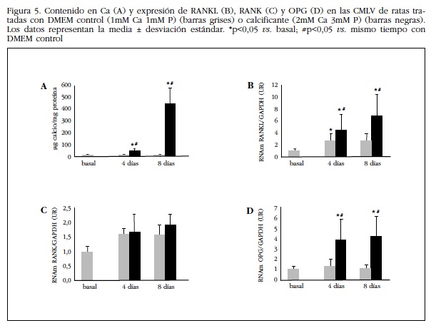Las CMLV tratadas con medio calcificante (DMEM F12, 2 mM de Ca, 3 mM de P) mostraron un incremento significativo del contenido de Ca tiempo dependiente (Figura 5A). De manera paralela aumentó la expresión de RANKL y OPG (Figuras 5B, 5C y 5D).