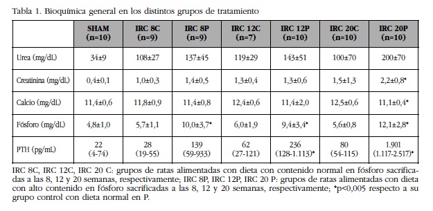 En los grupos que recibieron la dieta con alto contenido en P (IRC 8P, IRC 12P, IRC 20P) se observó un discreto empeoramiento de la función renal con respecto a sus controles (IRC 8C, IRC 12C, IRC 20C), el cual se agravó a las 20 semanas (Tabla 1). En el grupo de dieta con P alto el Ca sérico disminuyó significativamente sólo en la semana 20 (IRC 20P), mientras el P sérico se incrementó en todos los grupos con dieta alta en P, particularmente a las 20 semanas de tratamiento. De forma paralela al P, la PTH se incrementó a medida que aumentó el tiempo de tratamiento, siendo estadísticamente significativa a partir de la semana 12 y en particular en la semana 20, donde se observó un hiperparatiroidismo secundario severo (Tabla 1).