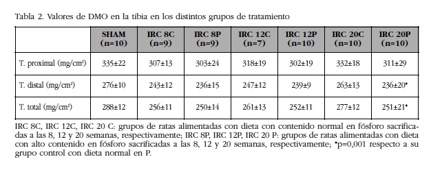 Si bien hubo un discreto descenso en la DMO de los grupos de animales con dieta alta en P respecto a sus controles en todos los sectores estudiados, éste sólo fue significativo a las 20 semanas (Tabla 2). Predominaron las pérdidas a nivel distal, donde hay mayor contenido de hueso cortical, sobre las pérdidas a nivel proximal (Tabla 2).