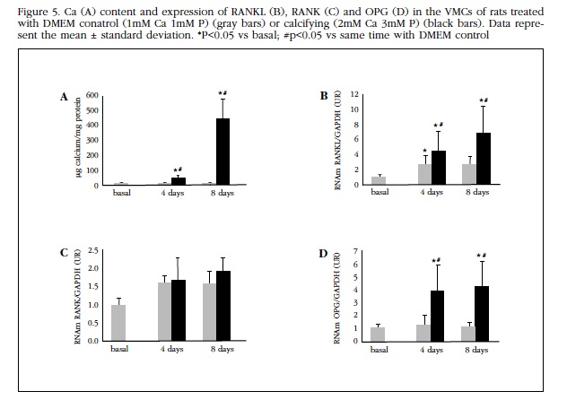 Las CMLV tratadas con medio calcificante (DMEM F12, 2 mM de Ca, 3 mM de P) mostraron un incremento significativo del contenido de Ca tiempo dependiente (Figura 5A). De manera paralela aumentó la expresión de RANKL y OPG (Figuras 5B, 5C y 5D).