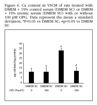 Para confirmar la idea de que el incremento de la expresión de RANKL es responsable del aumento contenido en Ca en CMLV tratadas con suero urémico, se adicionó al medio de cultivo 100 pM de OPG, lo que produjo un descenso significativo de la misma (Figura 6).