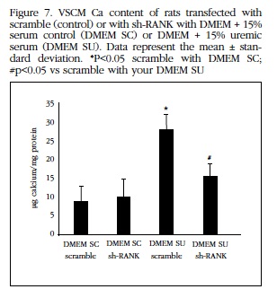 Del mismo modo, el silenciamiento del receptor RANK mediante la técnica de shRNA redujo de manera significativa el contenido de Ca de las CMLV tratadas con suero urémico (Figura 7).