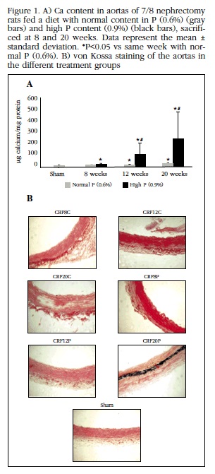 Si bien el contenido en Ca de las aortas de los animales alimentados con dieta con contenido en P normal se vio ligeramente afectado por la uremia, a partir de la semana 12 de IRC la administración de una dieta con alto contenido en P aumentó el contenido en Ca de forma significativa de forma tiempo-dependiente respecto al grupo Sham. Los animales que recibieron la dieta con P elevado incrementaron el contenido aórtico de Ca respecto a sus respectivos controles a partir de la semana 12, magnificándose este efecto en la semana 20. A pesar del incremento generalizado del contenido en Ca aórtico, la tinción de von Kossa reveló calcificaciones visibles en la aorta en solo el 50% de los animales con dieta con alto contenido en P (Figura 1).