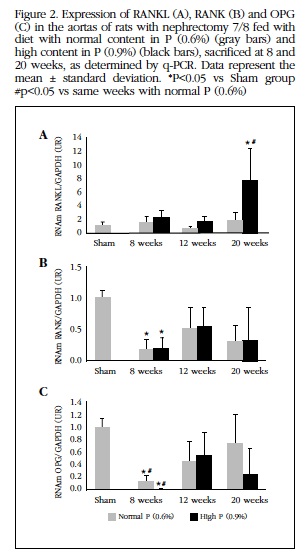 Paralelamente al incremento del contenido de Ca se produjo una elevación de la expresión de RANKL en la aorta (Figura 2A). La expresión de RANK no mostró diferencias a lo largo de la evolución de la IRC (Figura 2B), mientras que la OPG disminuyó en todos los grupos urémicos, particularmente en los que recibieron dieta con P elevado (Figura 2C).