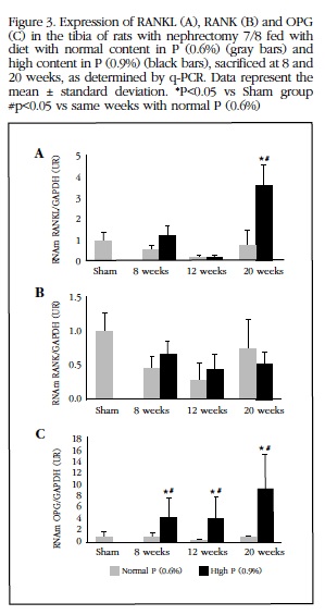 De acuerdo con lo observado en los marcadores bioquímicos analizados, el desarrollo de IRC se acompañó de alteraciones en el metabolismo óseo y mineral que se agravaron con la hiperfosforemia y el desarrollo de hiperparatiroidismo secundario. Es bien reconocido que este último aumenta el recambio óseo, afectando negativamente primero y de forma más severa al hueso cortical (siete/octavos de la tibia o zona distal) que al trabecular (octavo de la tibia o zona proximal), hecho corroborado en nuestros animales. Si bien la PTH es capaz de estimular la expresión de OPG, como se demuestra en las tibias de los animales con IRC con hiperfosforemia severa, esta hormona es también capaz de inducir la expresión de RANKL en los osteoblastos [11], pudiendo ser este gen responsable del descenso en la DMO registrado en el estudio densitométrico.