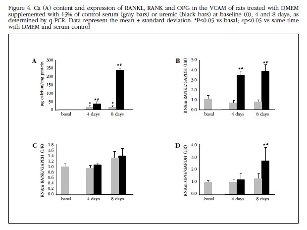 Algunos autores han descrito la calcificación vascular como un proceso activo y regulado por diversos factores. Las CMLV en las primeras etapas del proceso de calcificación sufren un cambio de su fenotipo y empiezan a expresar marcadores osteogénicos, que permitirían la mineralización de la matriz extracelular. Una de estas proteínas es RANKL, cuya expresión es abundante en osteoblastos. Tanto en las aortas y tibias de las ratas como en las CMLV se ha producido un aumento en la expresión de RANKL, agravado por el aumento de P en la dieta. En nuestro trabajo se muestra la relación directa existente entre el aumento en la calcificación y el incremento de RANKL. Los osteoblastos secretan RANKL, proceso que puede revertirse por acción de OPG, proteína que secuestra RANKL inhibiendo así la formación de osteoclastos al impedir que RANKL se una a su receptor RANK. El silenciamiento de RANK en nuestro modelo in vitro de calcificación con suero urémico inhibió el proceso de calcificación al impedir la unión del RANKL al RANK.