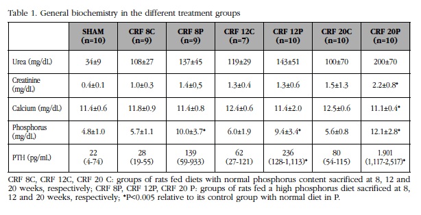 En los grupos que recibieron la dieta con alto contenido en P (IRC 8P, IRC 12P, IRC 20P) se observó un discreto empeoramiento de la función renal con respecto a sus controles (IRC 8C, IRC 12C, IRC 20C), el cual se agravó a las 20 semanas (Tabla 1). En el grupo de dieta con P alto el Ca sérico disminuyó significativamente sólo en la semana 20 (IRC 20P), mientras el P sérico se incrementó en todos los grupos con dieta alta en P, particularmente a las 20 semanas de tratamiento. De forma paralela al P, la PTH se incrementó a medida que aumentó el tiempo de tratamiento, siendo estadísticamente significativa a partir de la semana 12 y en particular en la semana 20, donde se observó un hiperparatiroidismo secundario severo (Tabla 1).