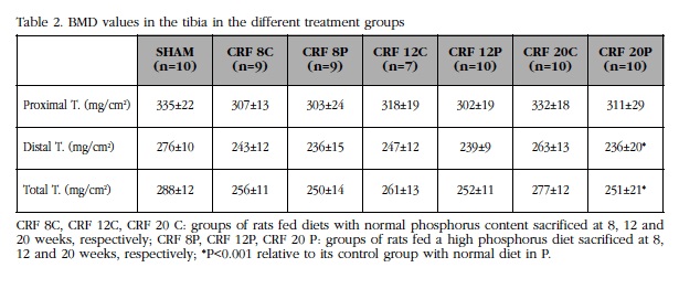 Si bien hubo un discreto descenso en la DMO de los grupos de animales con dieta alta en P respecto a sus controles en todos los sectores estudiados, éste sólo fue significativo a las 20 semanas (Tabla 2). Predominaron las pérdidas a nivel distal, donde hay mayor contenido de hueso cortical, sobre las pérdidas a nivel proximal (Tabla 2).