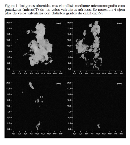 Las muestras de tejido valvular conservadas en etanol fueron analizadas mediante microtomografía computarizada (microCT) en un equipo SkyScan 1174 (Bruker, Kontich, Bélgica) disponible en el Bioterio de la Universidad de Oviedo. Las imágenes fueron obtenidas utilizando unos parámetros de 50 kV y 800 µA. Se obtuvieron unas 1.300 imágenes de cada una de las muestras con un paso de rotación de 0,3° y un promedio de marco de 2 para un escaneo de 180°. El escaneo de cada una de ellas duró entre 10 y 20 minutos (dependiendo del tamaño de la válvula) usando un tiempo de exposición de 6.200 ms. Se realizó la corrección de campo plano al principio de cada escaneo.