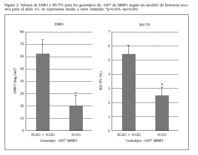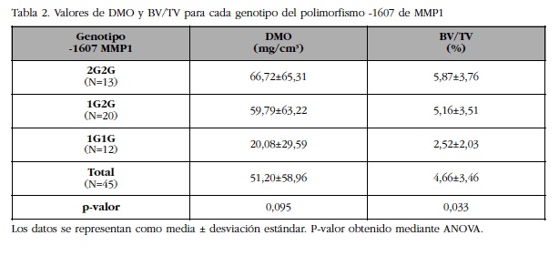 Se calcularon los valores medios de DMO y BV/TV en los grupos de población definidos por los distintos genotipos para el polimorfismo -1607 de MMP1 y se encontraron diferencias en ambas variables, aunque éstas eran estadísticamente significativas sólo en el caso del BV/TV (Tabla 2).