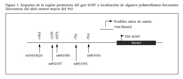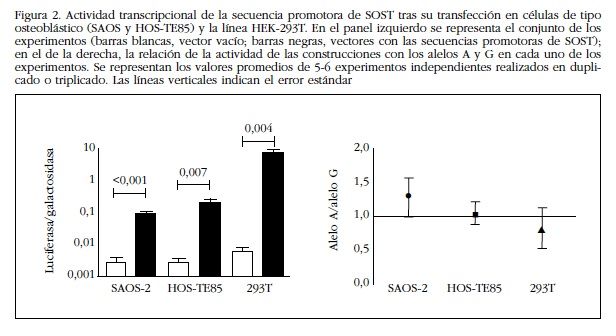 En consonancia con el papel biológico de la esclerostina, las variantes alélicas del gen SOST parecen influir en la masa ósea. Así, en algunos estudios de barrido genómico (GWAS) y en otros estudios de asociación genética, se ha encontrado una relación entre algunos polimorfismos frecuentes del gen SOST y la densidad mineral ósea (DMO). De hecho, nuestro grupo encontró una asociación entre unos polimorfismos situados en la región promotora de SOST y la DMO en mujeres postmenopáusicas [12]. El objetivo del presente estudio fue explorar la capacidad reguladora de uno de esos polimorfismos mediante estudios funcionales in vitro. Para ello hemos utilizado vectores en los que el promotor de SOST se ha insertado delante de un gen reportero que codifica una proteína (luciferasa) cuya actividad es fácilmente medible, y hemos realizado experimentos para comprobar la capacidad de fijación de proteínas nucleares a esas regiones valorando el retardo de la movilidad electroforética.