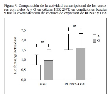 La co-transfección de vectores que expresan constitutivamente RUNX2 y OSX aumentó la actividad transcripcional del promotor de SOST (en promedio, 2,5±0,9 veces sobre el valor basal para el alelo A y 1,9±0,8 veces para el alelo G; en ambos casos p<0,05). Este aumento también resultó ser independiente de qué alelo estaba presente en el promotor de SOST (Figura 3).