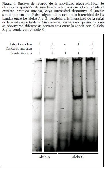 Por otro lado, en los experimentos de retardo de la movilidad electroforética comprobamos que la región donde radica ese polimorfismo era capaz de fijar proteínas nucleares, presumiblemente con función reguladora, sin que observáramos diferencias entre ambos alelos (Figura 4). Por ello, no se efectuaron estudios ulteriores para identificar la naturaleza de esas proteínas.