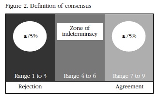 Los participantes puntuaron las preguntas mediante una escala Likert de 9 puntos, de acuerdo con cada una de las cuestiones presentadas, desde dos perspectivas: "deseo" (1=rechazo total; 9=deseo más fuerte) y "pronóstico" (1=no ocurrirá en absoluto; 9=ocurrirá con máxima probabilidad). Se alcanzó consenso cuando al menos el 75% de los participantes puntuaron las preguntas entre 7-9 (acuerdo) o entre 1-3 (desacuerdo) (Figura 2).