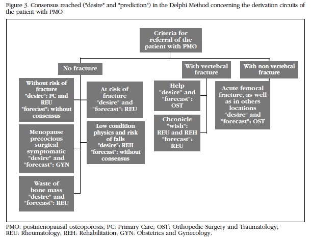 Objectives: To reach a consensus on the medical care circuits of patients with postmenopausal osteoporosis (PMO), including derivation and management (assessment tools and medical tests), identifying profiles according to the opinion of bone metabolism experts, from Spain’s Health Service. Material and methods: The Delphi technique was used with two successive consultation rounds, with 38 experts in PMO management belonging to 14 scientific societies taking part in the study. Review of literature and the opinion of the scientific committee rounded out the questionnaire. The experts expressed their "desire" (1=total rejection, 9=stronger desire) and "forecast" (1=will absolutely not occur; 9=will occur with maximum probability) about the issues raised. A consensus was reached when 75% or more of the participants scored 1-3 (disagreement) or 7-9 (agreement). In addition, experts were divided up into 3 discussion groups to complement the information according to patient profiles found previously in the Delphi method. Results: Consensus was reached on 75% of the questions. The experts established three profiles of PMO patients: no fracture, vertebral fracture and non-vertebral fracture, as well as the diagnostic and therapeutic resources recommended for these patients. The patient without a fracture should be managed in Primary Care or Rheumatology and scales will be used to evaluate fracture risk in early stages of the disease. The patient with chronic vertebral fracture should refer to Rheumatology and Rehabilitation, and will be Rheumatology, whereas the patient with acute vertebral fracture should be treated in Orthopedic Surgery, and this is how it will possibly happen. Diagnosis of vertebral fracture patients will be based mainly on x-rays. To assess progress, questionnaires on the functional capacity and pain scales are recommended. However, these will not be used due to the lack of time involved. The patient with non-vertebral fracture should be and will be referred to Orthopedic Surgery, with 3-4 radiographs recommended to ensure fracture consolidation. Conclusions: Delphi method results indicate that referral of PMO patients are concentrated in Primary Rheumatology, when there is no fracture, and Orthopedic Surgery, in the case of fracture.