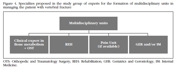 El grupo de discusión también señaló que REH debería ser la especialidad de referencia en el caso de pacientes con fractura vertebral y restricción funcional secundaria a la inmovilización y tratamiento farmacológico, o si se requieren medidas ortopédicas. Aquellos pacientes con fractura vertebral y dolor crónico refractario al tratamiento farmacológico deberían ser manejados por dos grupos de especialistas, Unidad del Dolor (o MI, dependiendo de la disponibilidad) en coordinación con REH para el manejo del dolor y por REU en coordinación con Medicina Interna o expertos en el metabolismo óseo (dependiendo de la disponibilidad del hospital).