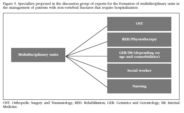 El grupo de discusión estableció que durante la fase aguda COT debería ser la especialidad de referencia. El diagnóstico de fractura no vertebral en pacientes con OPM debería ser realizado por COT, de forma tal que se pueda evaluar la gravedad de la fractura e indicar tratamiento y rehabilitación. La admisión hospitalaria requiere de unidades multidisciplinarias (Unidad de Fracturas o FLS) que incluyan COT, REH, GER o MI, Servicios Sociales y Enfermería (Figura 5). Atención Primaria debería estar implicada en el manejo ambulatorio de estas pacientes una vez el proceso agudo ha sido controlado. Además, AP debería ser la especialidad encargada de prevenir fracturas no vertebrales sucesivas.