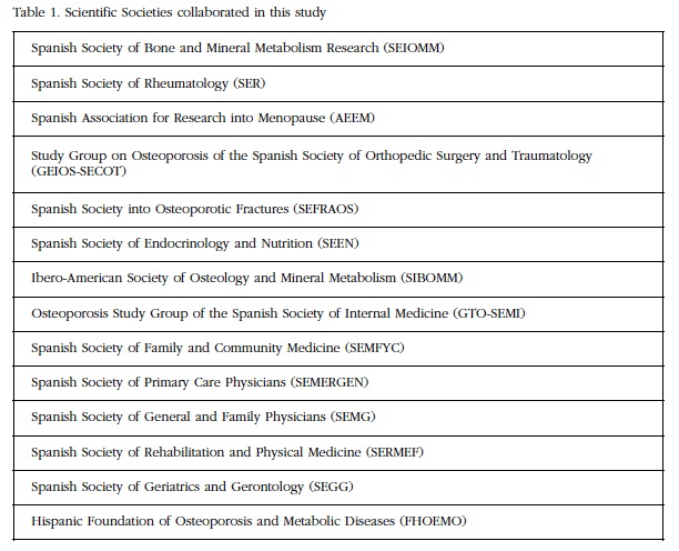Los autores desean expresar su gratitud por su participación en el estudio a: Dr. Rafael Sánchez-Borrego, miembro de la Asociación Española para el Estudio de la Menopausia (AEEM); Dr. Manuel Díaz Curiel, miembro de la Fundación Hispana de Osteoporosis y Enfermedades Metabólicas (FHOEMO); Dr. Manuel Mesa, miembro de la Sociedad Española de Cirugía Ortopédica y Traumatología (SECOT); Dr. Esteban Jódar, miembro de la Sociedad Española de Endocrinología y Nutrición (SEEN); Dr. Pedro Carpintero, miembro de la Sociedad Española de Fracturas Osteoporóticas (SEFRAOS); Dra. Carmen Navarro, miembro de la Sociedad Española de Geriatría y Gerontología (SEGG); Dra. Carmen Valdés, miembro de la Sociedad Española de Médicos de Atención Primaria (SEMERGEN); Dr. Vicente Giner, miembro de la Sociedad Española de Medicina de Familia y Comunitaria (SEMFYC); Dr. José Carlos Bastida, miembro de la Sociedad Española de Médicos Generales y de Familia (SEMG); Dr. José Luis Pérez, miembro de la Sociedad Española de Medicina Interna (SEMI); Dr. Alberto García, miembro de la Sociedad Española de Reumatología (SER); Dra. Elena Martínez, miembro de la Sociedad Española de Rehabilitación y Medicina Física (SERMEF); y Dr. Santiago Palacios, miembro de la Sociedad Iberoamericana de Osteología y Metabolismo Mineral (SIBOMM).