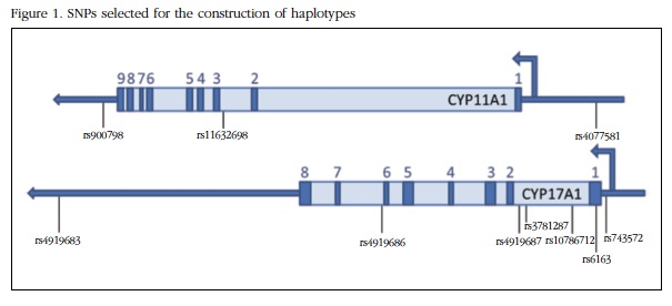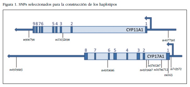 Los haplotipos del gen CYP17A1 se construyeron de la misma manera con los SNPs rs743572, rs6163, rs10786712, rs3781287, rs4919687, rs4919686 y rs4919683.