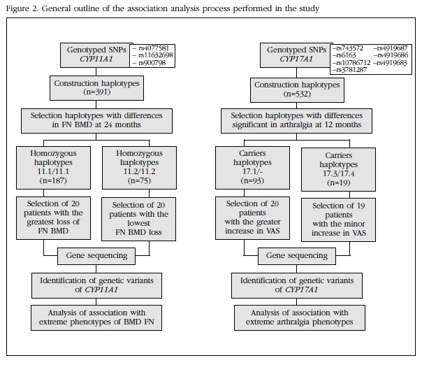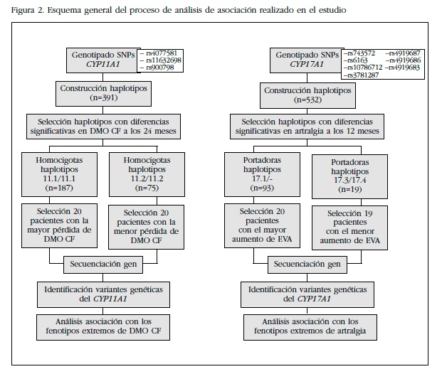 La frecuencia de los SNPs del CYP11A1 y CYP17A1 fue estimada con el algoritmo esperanza-maximización. La asociación entre los haplotipos y los fenotipos (cambio de DMO en CF y aumento de dolor) se analizó con el haplo.glm, basado en análisis de regresión glm, ajustando por edad, índice de masa corporal (IMC), terapia previa con tamoxifeno y quimioterapia. El haplotipo más común fue utilizado como haplotipo de referencia y se asumió el modelo aditivo obteniendo un valor p y el β-coeficiente respecto el haplotipo de referencia.
