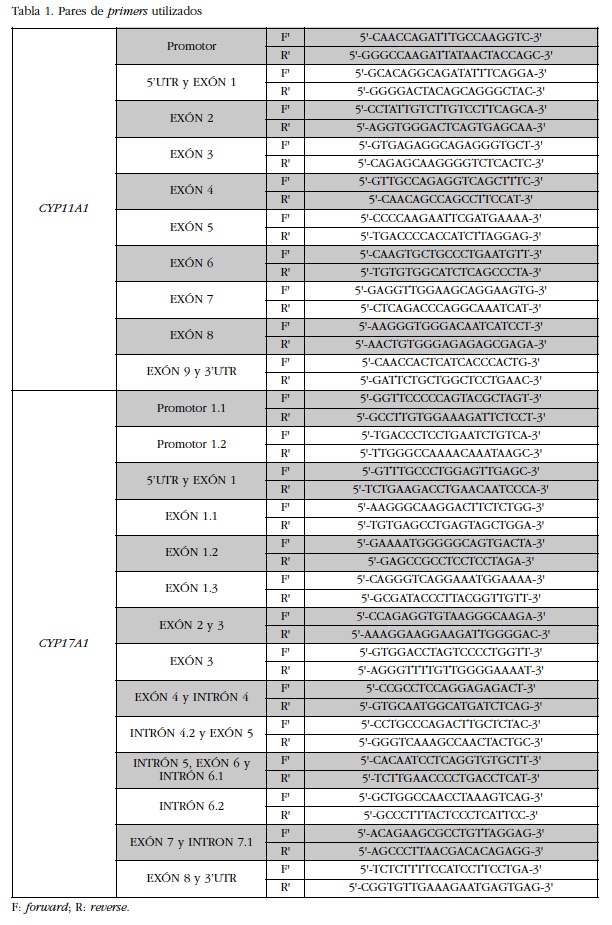 La extracción de ADN se realizó a partir de sangre periférica empleando el kit de purificación de ADN Wizard® Genomic DNA Purification Kit (PROMEGA). Se amplificaron las regiones codificantes, 5’UTR, 3’UTR y promotor proximal (hasta el -601 pb para el CYP11A1 y -589 pb para el CYP17A1) con los primers descritos en la tabla 1.