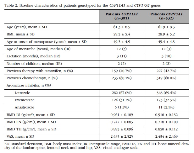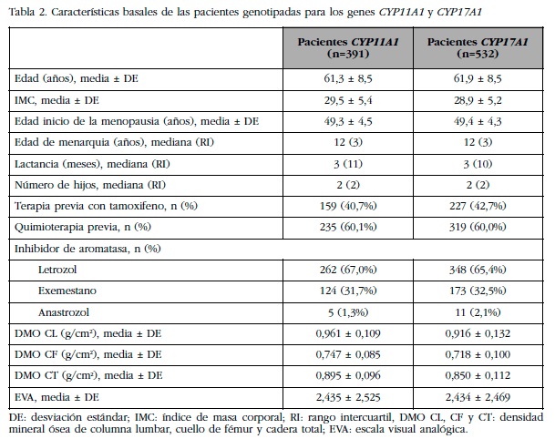 En la tabla 2 se muestran las características demográficas, los valores de DMO y la evolución de la sintomatología musculoesquelética mediante EVA, para los genes CYP11A1 y CYP17A1, en las que se procedió a la construcción de los haplotipos.