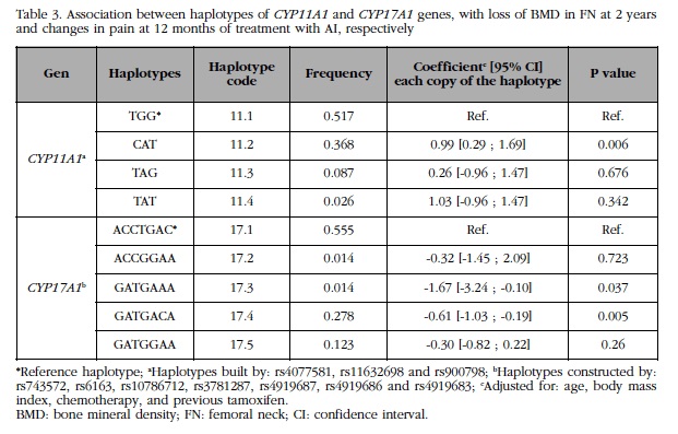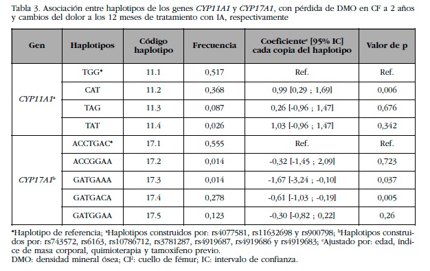 En la tabla 3 se muestran los haplotipos construidos y el análisis de asociación de los genes CYP11A1 y CYP17A1 con el cambio de DMO en CF a los 2 años y el aumento de dolor a los 12 meses de tratamiento con IA, respectivamente.