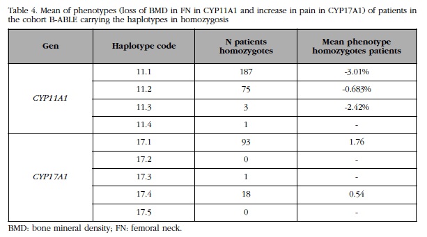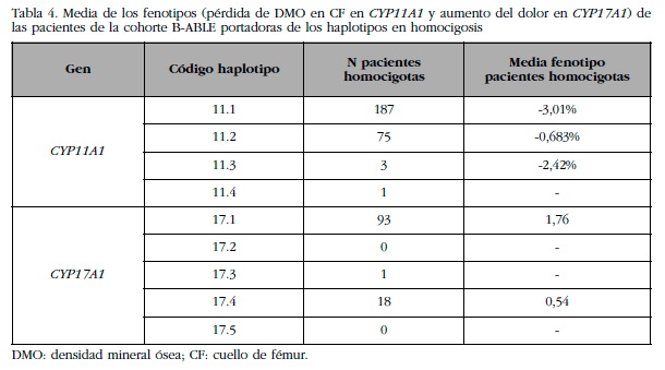 En el gen CYP11A1, el haplotipo que mostró una mayor diferencia fenotípica respecto el haplotipo de referencia (11.1) fue el 11.2, donde las pacientes portadoras del haplotipo 11.1 en homocigosis tenían una pérdida de DMO de 4,41 veces mayor que las portadoras del haplotipo 11.2 en homocigosis (Tabla 4).