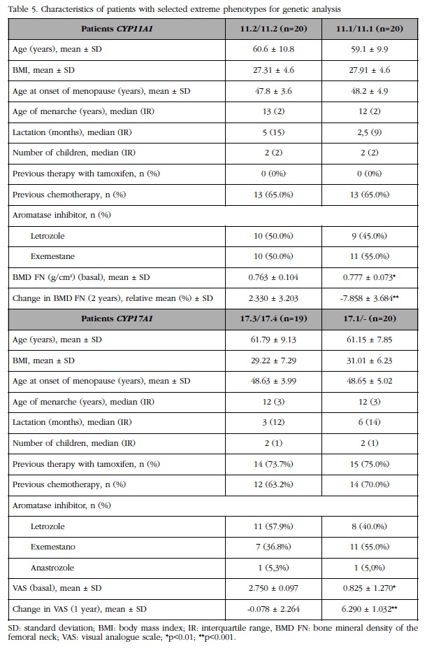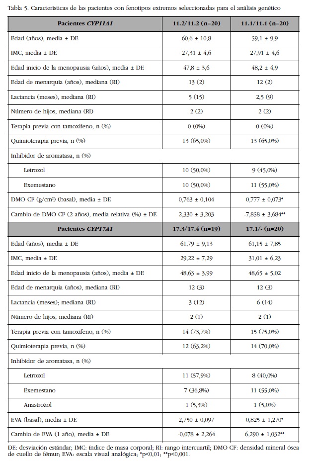 Posteriormente, dentro de cada grupo haplotípico del gen CYP11A1 se escogieron a las pacientes que mostraban un fenotipo extremo en la DMO de CF (mayor o menor pérdida de DMO a los 24 meses de tratamiento) (n=40). El mismo proceso se llevó a cabo para los grupos haplotípicos del gen CYP17A1 en que se seleccionaron aquellas pacientes con el fenotipo extremo para artralgia (mayor o menor aumento del dolor los 12 meses de tratamiento) (n=39) (Tabla 5).