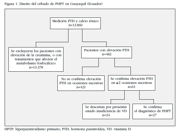 El presente sería el primer estudio para evaluar la prevalencia del HPTP en la ciudad de Guayaquil (Ecuador), aplicando un cribado bioquímico uniforme, por medio de la medición simultánea de hormona paratiroidea (PTH) y calcio iónico sérico, y comparar nuestros resultados con los reportados en la literatura internacional.